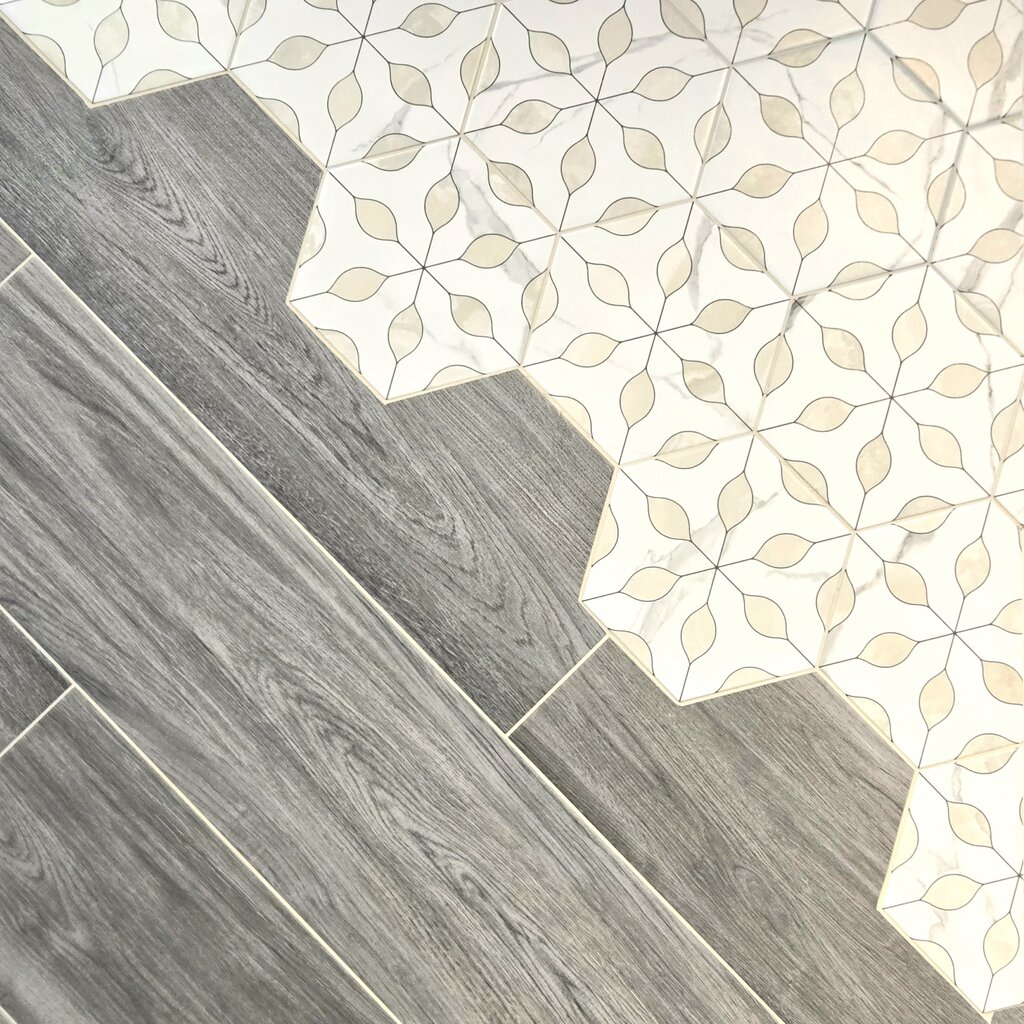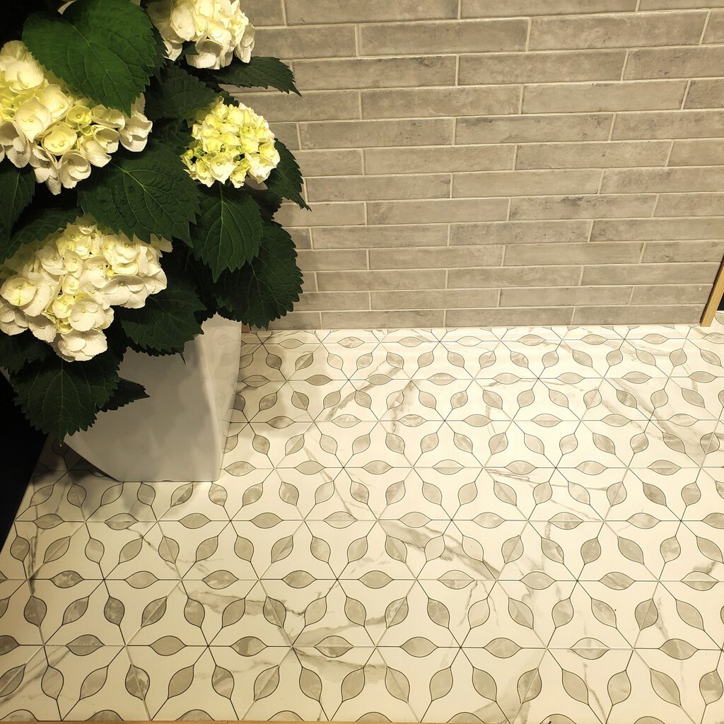 Here we have an elegant floral pattern glazed over a high quality marble inkjet in a whimsical hexagon shape. These tiles may look delicate to the eye but are made of first quality porcelain that requires no special care or feeding, are stain-free and easy to clean. They would be at home as a kitchen backsplash, a shower wall or and entryway floor.